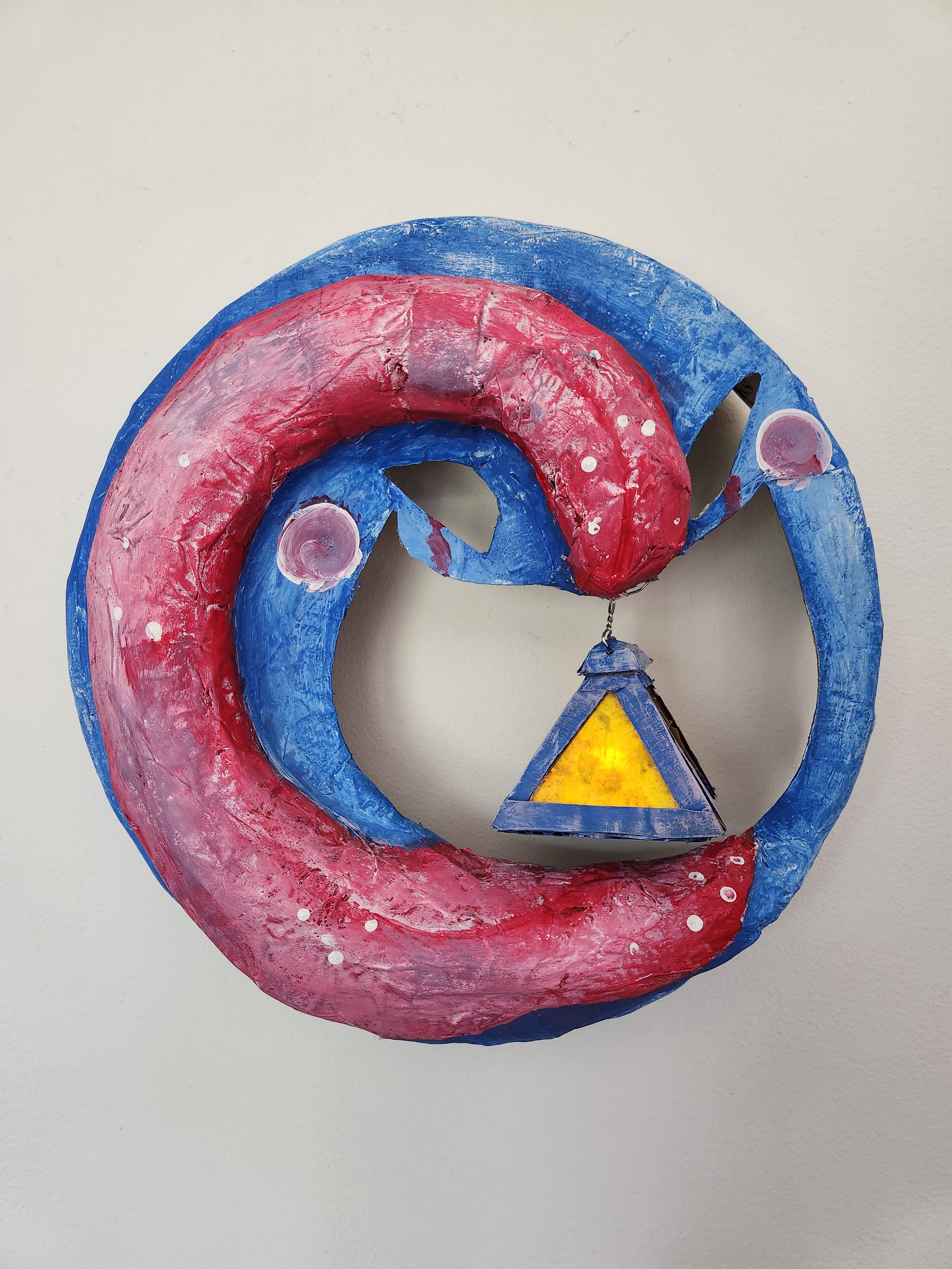 One of a kind sculpture. Masktober day 2/31. Made of cardboard, papier mache, tissue paper and wire. Includes battery operated electronic tealight and replacement.